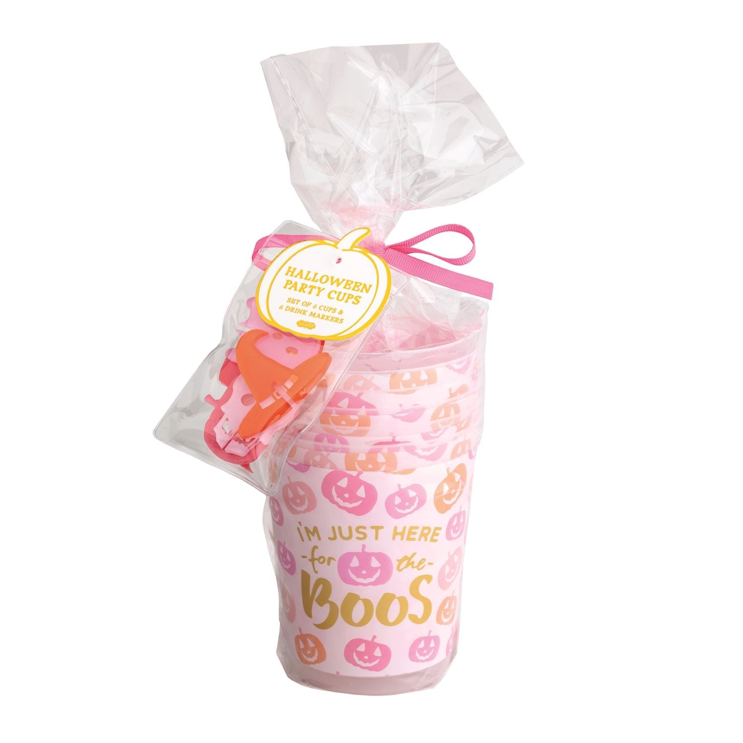 Get the party started with this playful 12-piece Halloween set! Featuring six pink cups printed with cheerful pumpkins and the phrase “I’m Just Here for the Boos,” this set comes wrapped in cello and tied with a bow—ready to gift or use. Included are six coordinating acrylic drink markers, so every ghoul and goblin can easily spot their cup. Perfect for spooky soirées, girls’ nights, or Halloween happy hours!