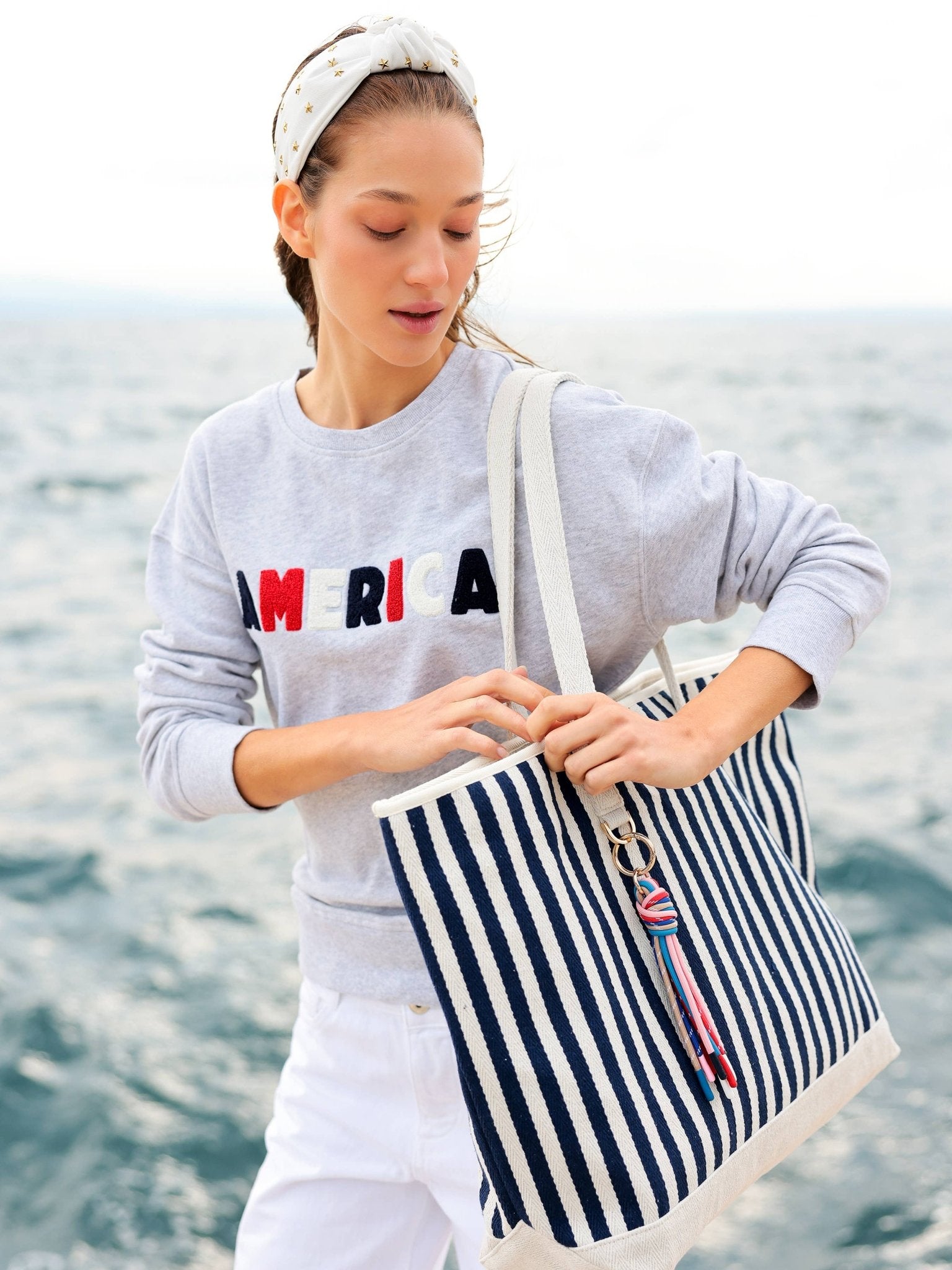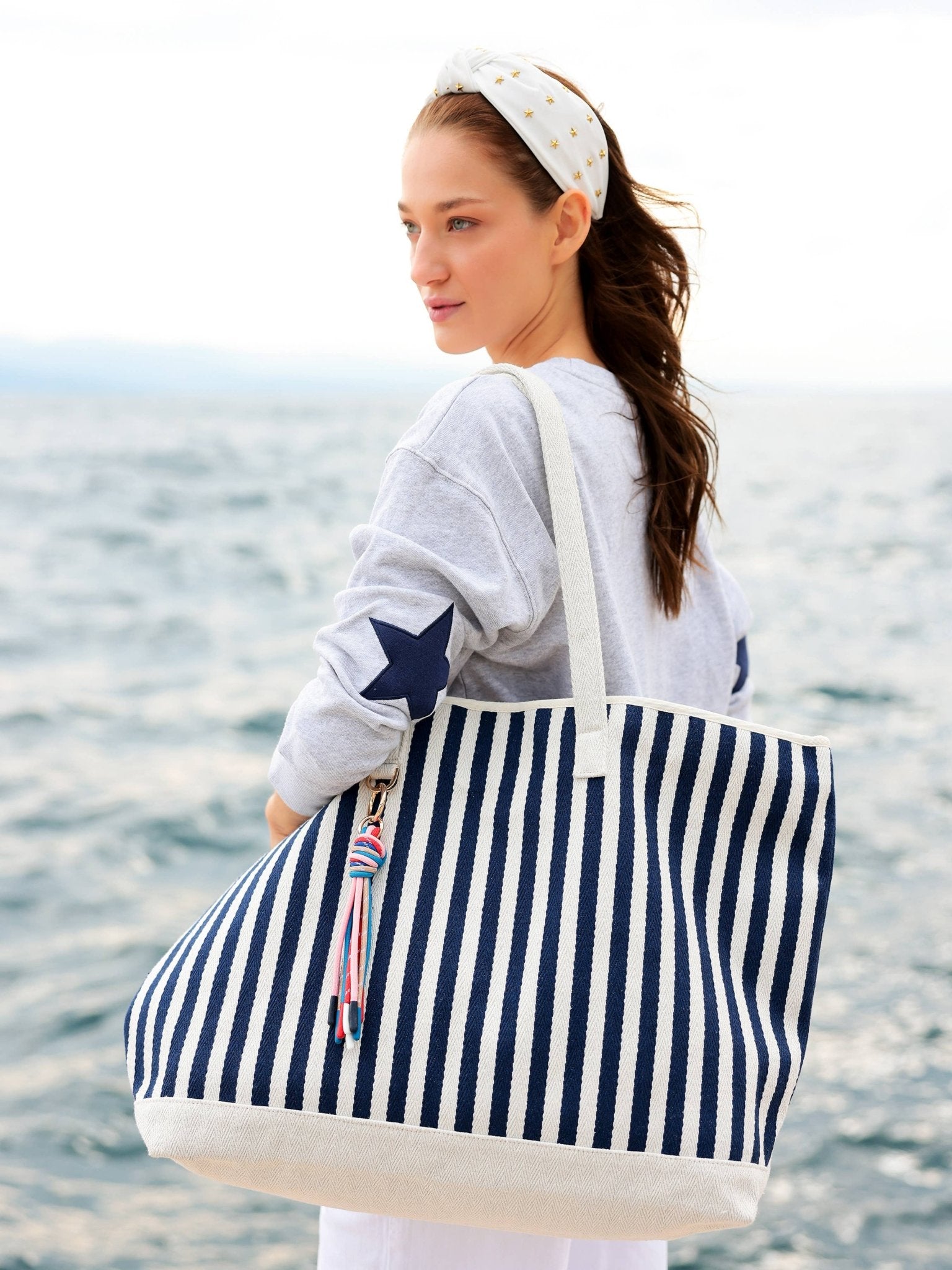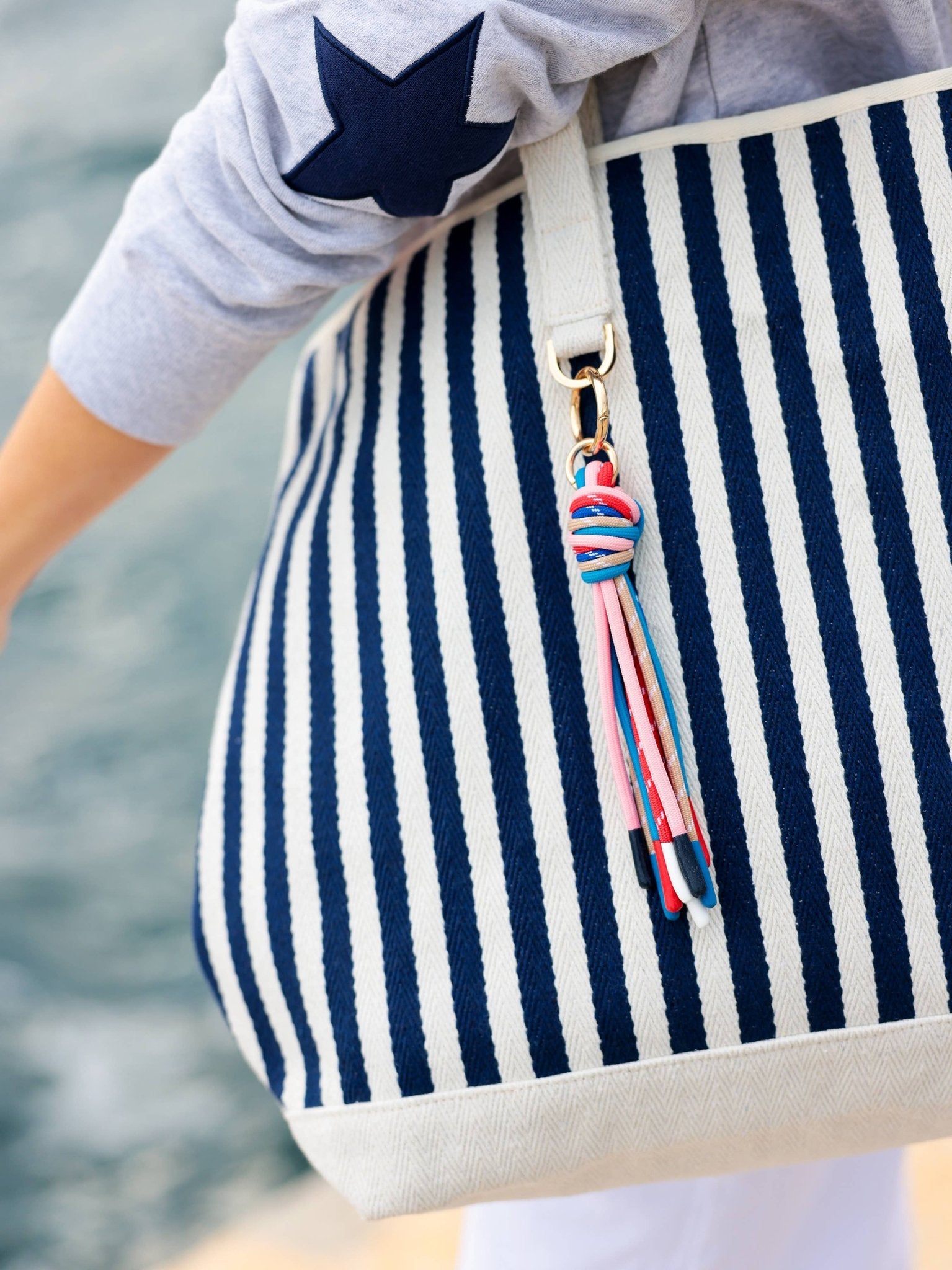 This double-strapped tote features a playful rope tassel and eye-catching navy and white stripes.