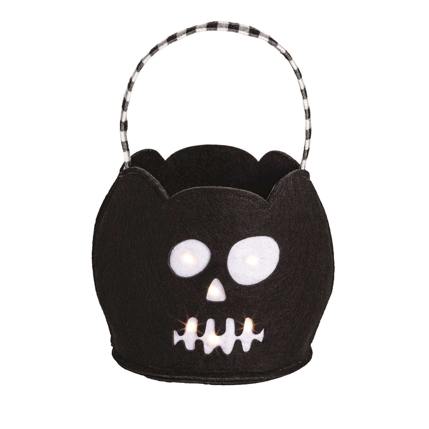 This light-up felt pumpkin bucket makes Halloween night even more magical! With a friendly jack-o'-lantern face that glows and projects spooky shapes onto the sidewalk, it's both fun and functional. The soft felt body is lightweight for kids to carry, and the glittered stem adds just the right amount of sparkle. Requires 2 AAA batteries (not included). Designed for ages 3 and up.